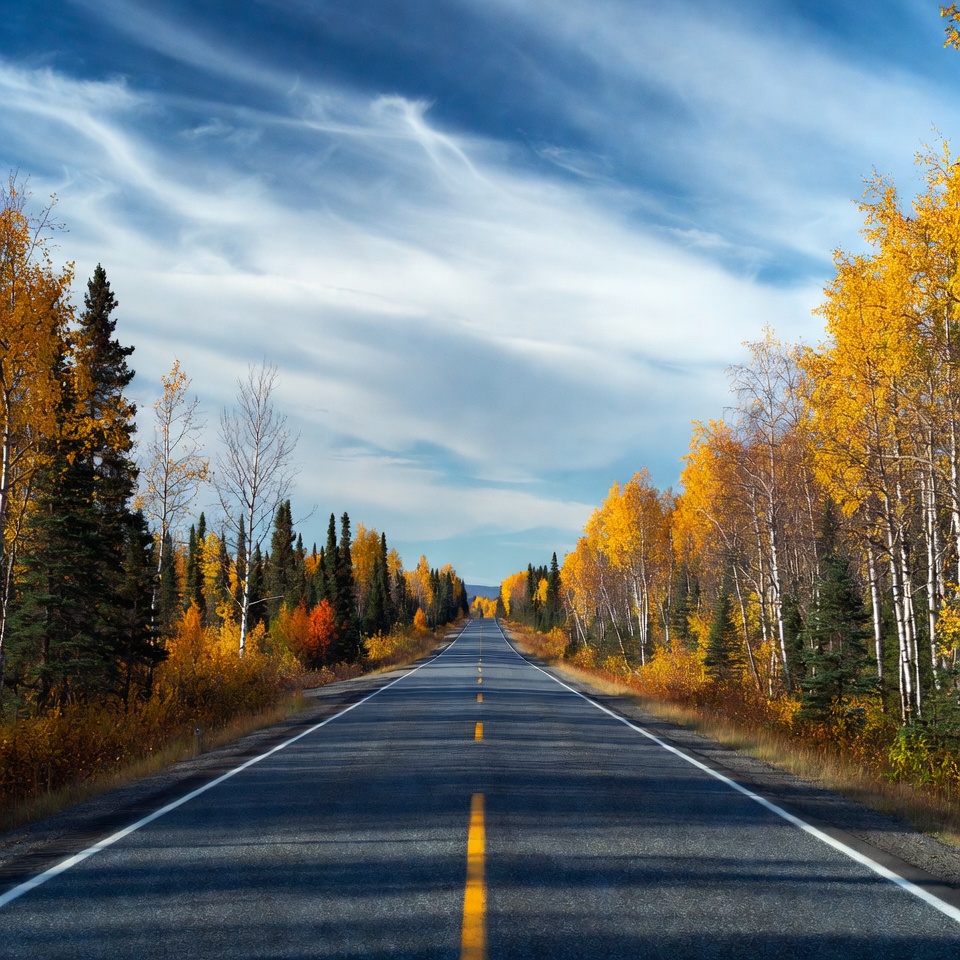 asphalt highway, autumn colors, birch trees, blue sky, clouds, fall forest, fall landscape, foliage, golden leaves, nature landscape, pine trees, rural road, scenic drive, seasonal scenery, straight road, tree lined road, vibrant trees, wooded path, yellow trees, autumn road