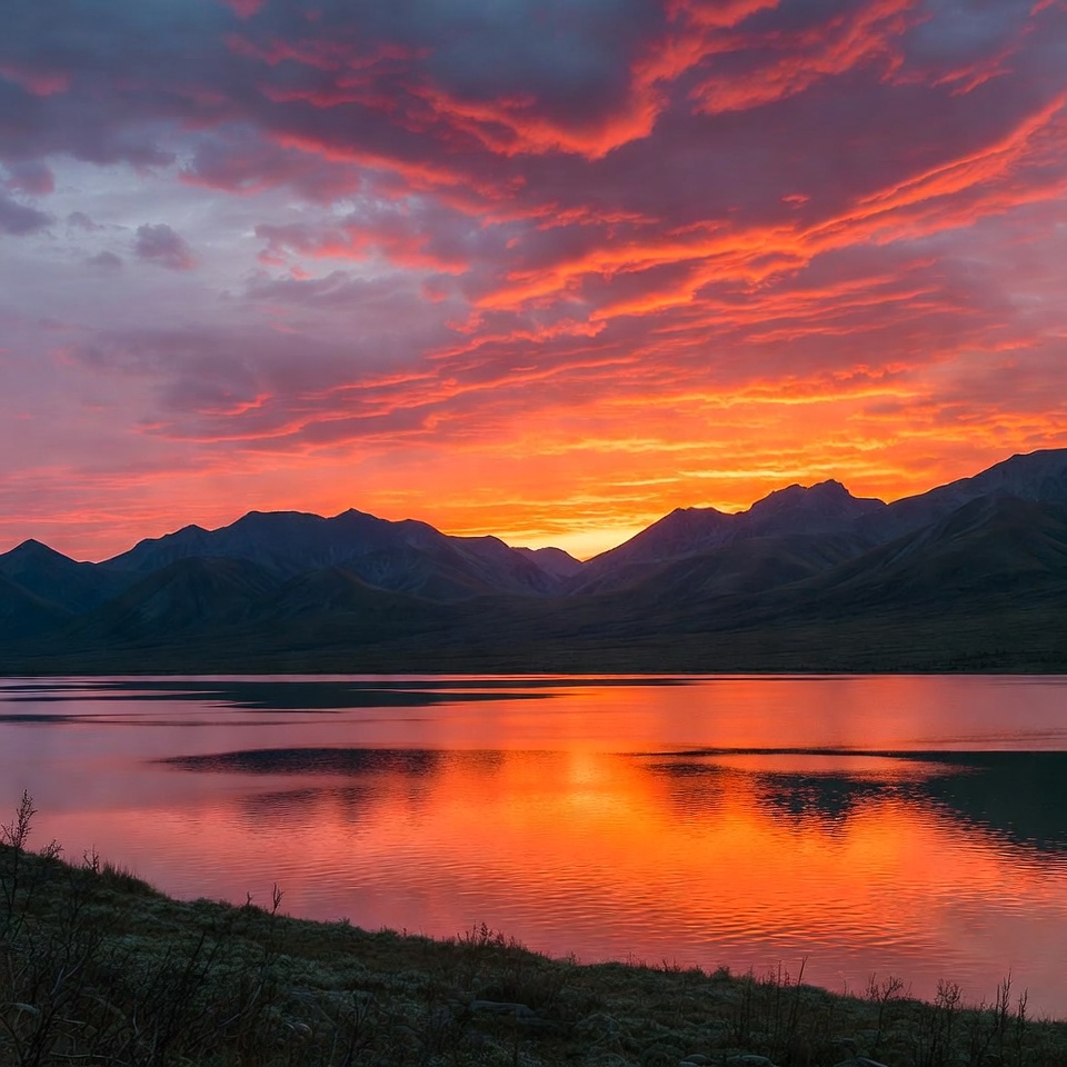 alpine, calm water, clouds, dramatic sky, dusk, fiery sunset, grass, horizon, lake, landscape, mountain range, mountains, nature, orange sky, peaks, purple hues, red clouds, reflection, scenery, serene lake, sky, vibrant colors, water, wilderness, sunset