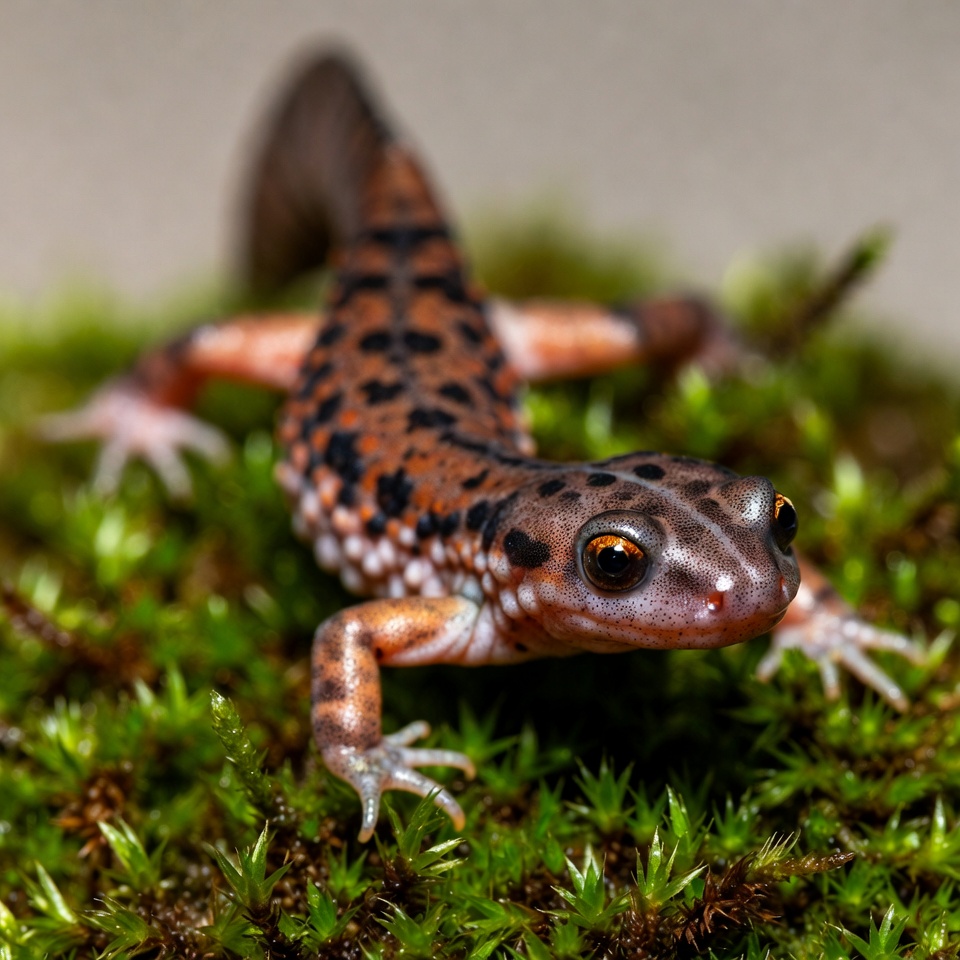 A small spotted salamander with orange and black spots sits on a bed of green moss. Its large orange eyes gaze forward, and its smooth skin shows distinct spotting patterns. The amphibian is positioned in a front-facing pose with legs extended.