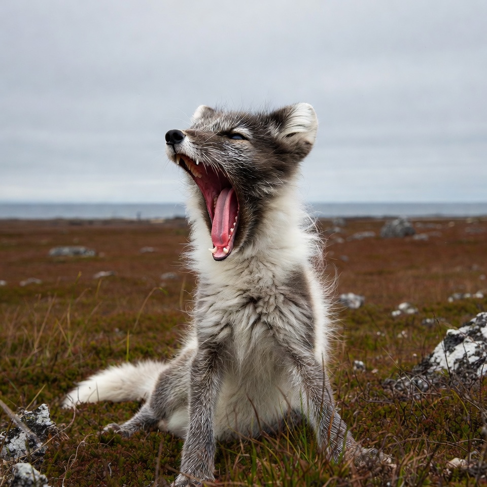 animal, arctic, cloudy sky, ears, fluffy fur, fox, grass, gray fur, moss, nature, ocean, open mouth, pink mouth, rocks, sitting fox, tail, tongue, tundra, white fur, wild animal, wildlife, yawning, arctic fox