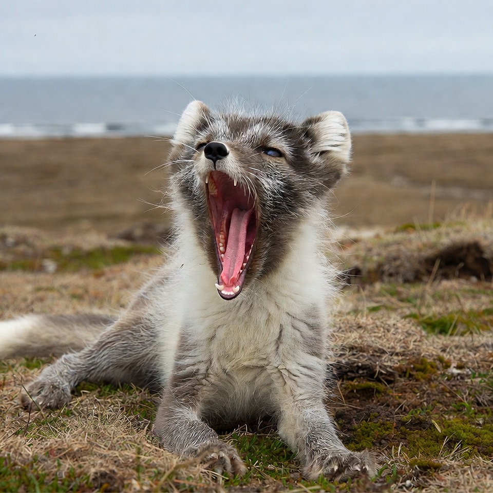 animal, arctic wildlife, beach, blue eyes, coastal, ears, fox, fur, grass, grey fur, nature, ocean, paws, sand, sea, teeth, tongue, tundra, white fur, wild animal, wildlife, yawn, yawning, arctic fox