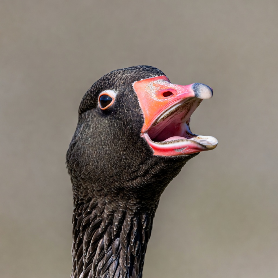 A greylag goose with black feathers and a bright orange beak faces forward with its mouth wide open in a honk. Its eyes are wide and expressive against a plain beige background. The detailed feathers and pink interior of the mouth are clearly visible.