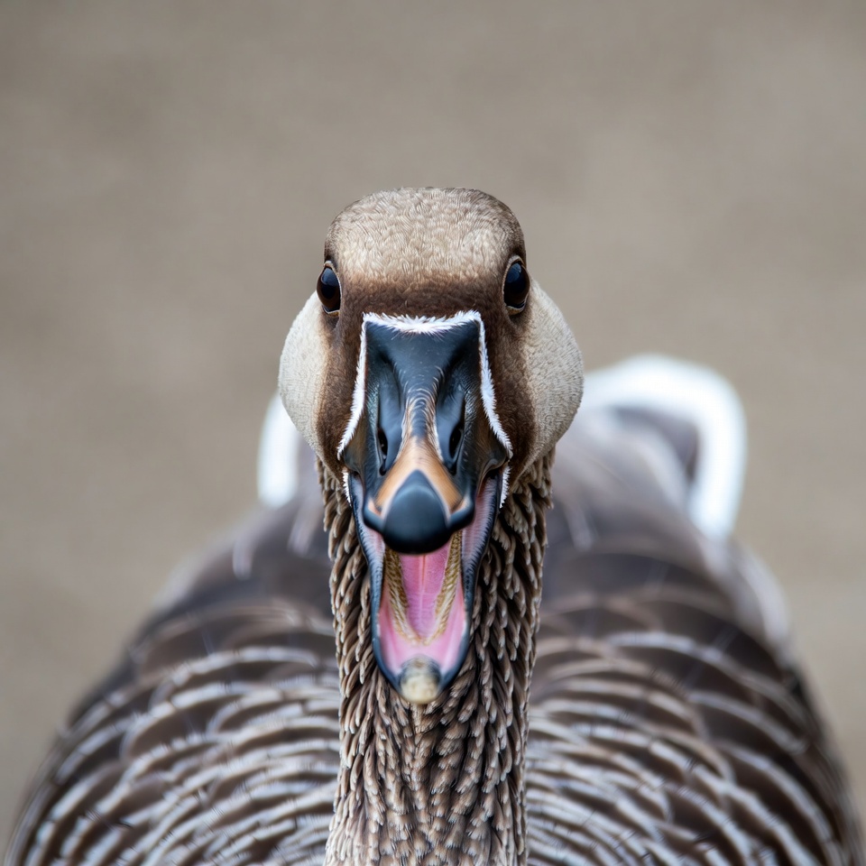 A close-up of a goose facing forward with its beak wide open, revealing a pink tongue and black bill. The goose has brown feathers with white markings around the neck and eyes. It stands against a blurred beige background.