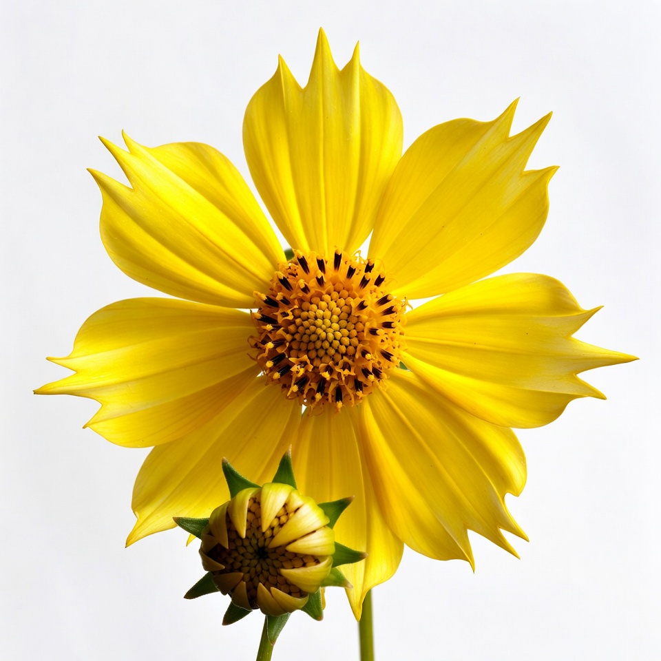 bloom, botany, brown center, daisy-like flower, floral, flower bud, green bud, green stem, isolated background, nature, petals, vibrant yellow, white background, yellow flower, cosmos flower