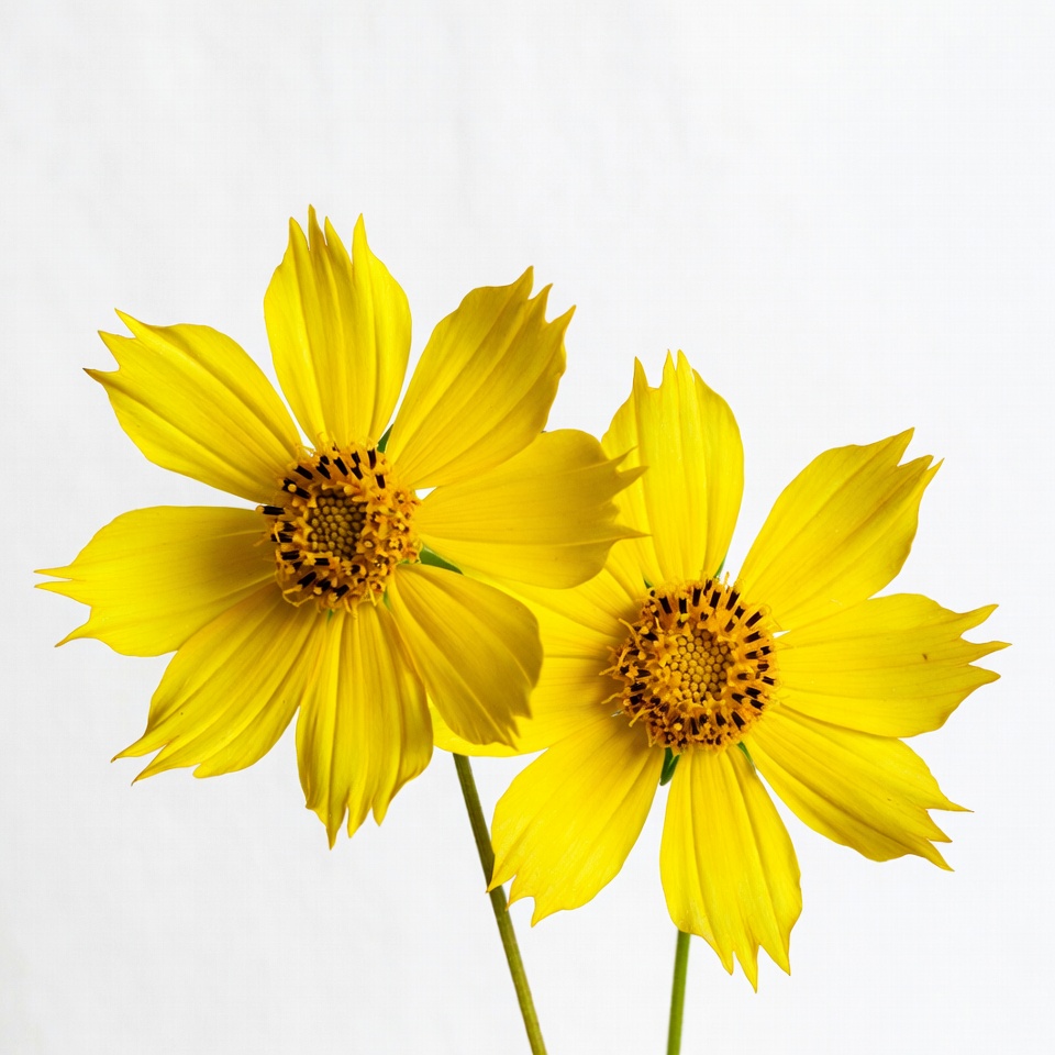 blooming flowers, botany, brown center, daisy-like flowers, floral, flower closeup, fringed petals, isolated background, nature, petals, stems, two flowers, vibrant yellow, white background, yellow flowers, cosmos flowers
