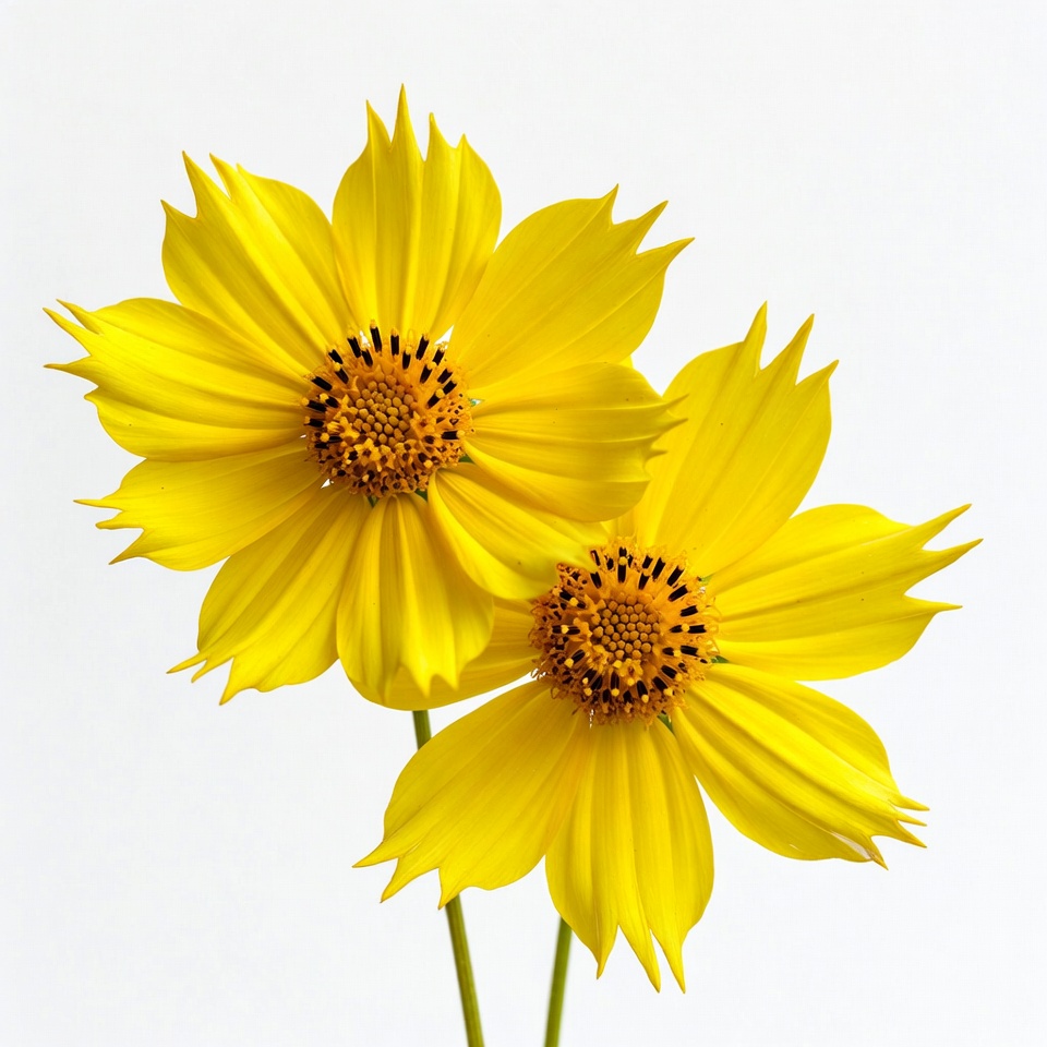 Two vibrant yellow black-eyed susan flowers with dark brown centers stand on thin green stems. Their petals radiate outward in a star-like pattern against a plain white background. The flowers are positioned side by side, isolated for clear visibility.