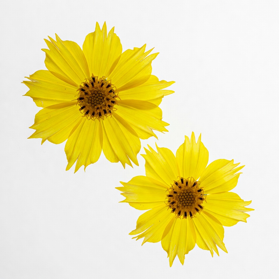 bloom, bright yellow, brown center, daisy-like flower, floral, flower closeup, fringed petals, garden flower, isolated flower, nature, petals, two flowers, white background, yellow flower, cosmos flower