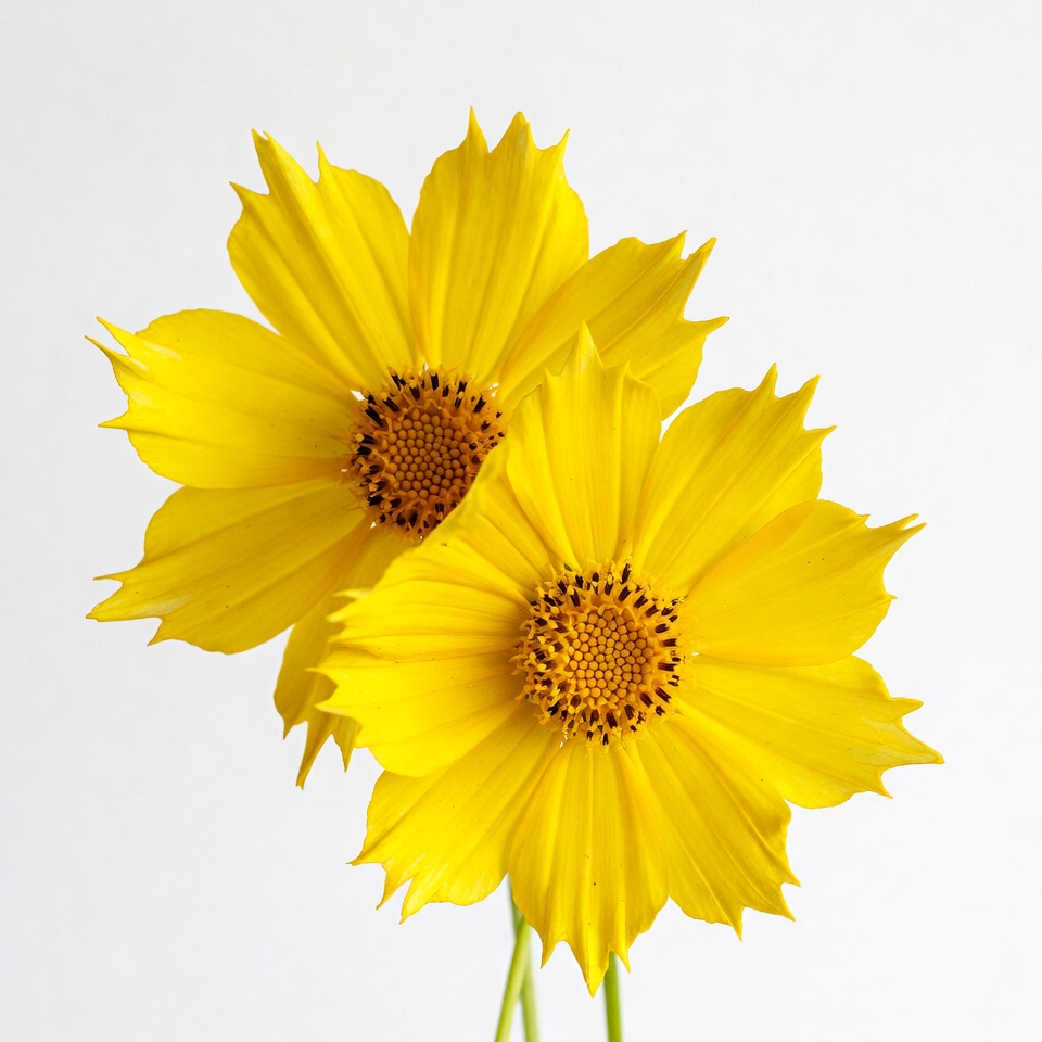 blooms, brown center, floral, flower closeup, garden flowers, green stems, isolated flowers, nature, petals, ruffled petals, two flowers, vibrant yellow, white background, yellow flowers, cosmos flowers