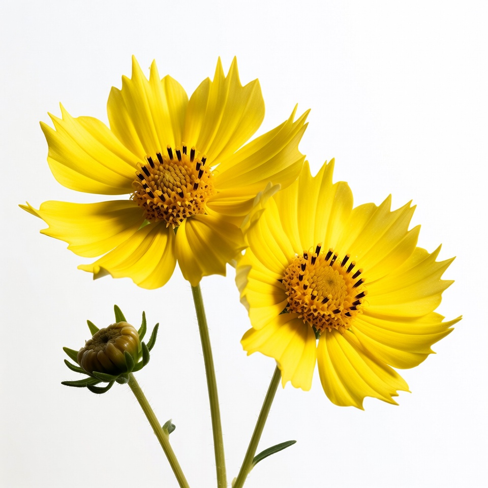 blooming flowers, brown center, daisy-like, floral, flower bud, flowers, garden flowers, green stems, isolated, nature, ruffled petals, white background, yellow flowers, yellow petals, coreopsis