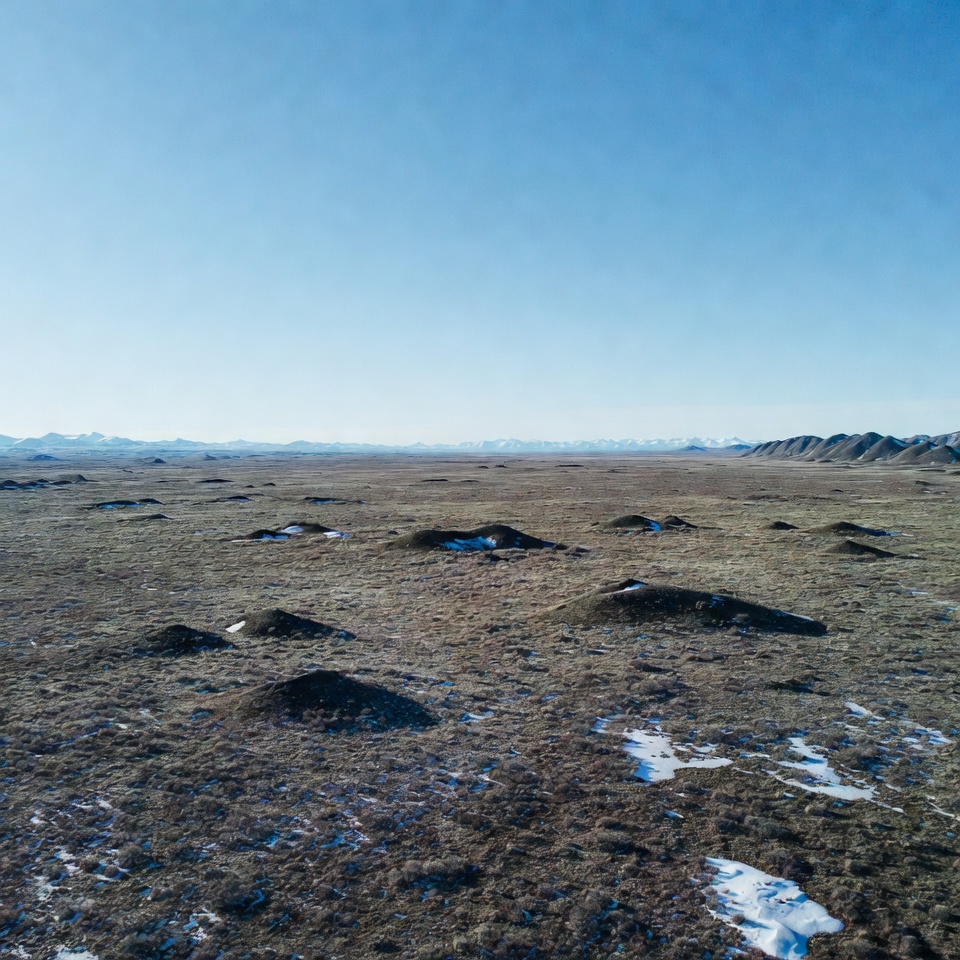 aerial view, barren land, blue sky, cold weather, dry grass, grass, hills, horizon, landscape, mountains, nature, outdoors, remote, snow, snowy patches, steppe, tundra, vast plain, wilderness, anthills