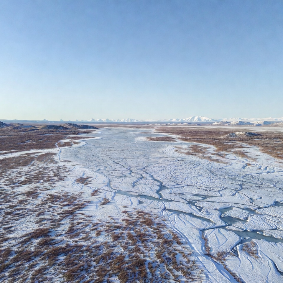 An aerial view shows a frozen river winding through a vast snowy tundra landscape. Cracked ice covers the river surface amid brown grasses and distant snow-capped mountains. The scene features a clear blue sky overhead.