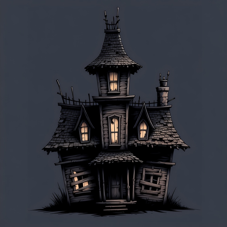 A dark, gothic haunted house stands on a grassy base against a navy background. It features tall peaked roofs, boarded windows, lit eerie windows, and jagged spires. The ink-style drawing emphasizes weathered wood and ominous architecture.