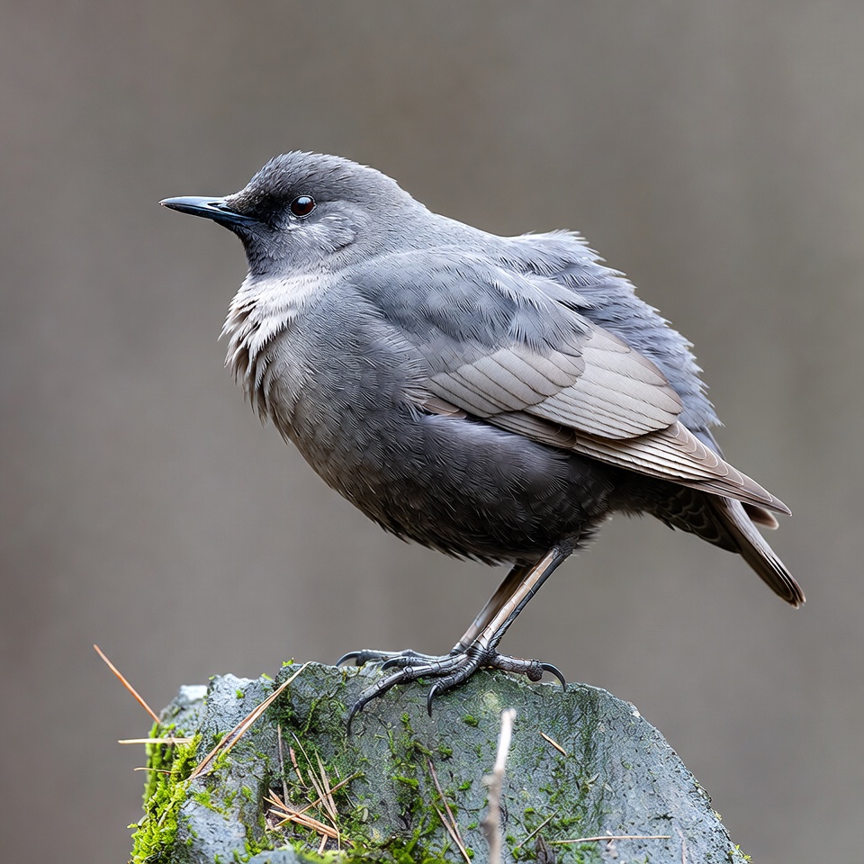 avian, bird, dark beak, feathers, fluffy bird, grey starling, isolated background, mossy rock, nature, orange legs, perching bird, ruffled feathers, songbird, wildlife, starling