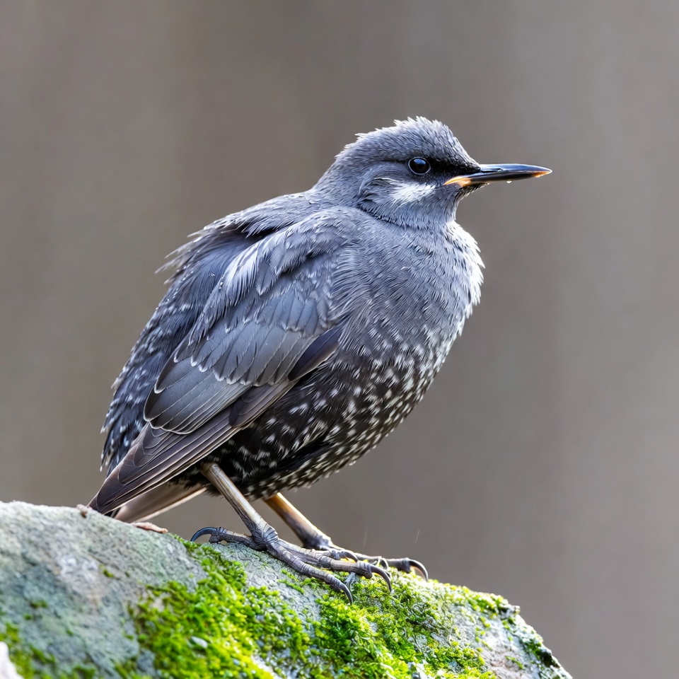 avian, bird, fluffy feathers, gray feathers, green moss, isolated background, mossy rock, nature, orange beak, perched bird, songbird, spotted feathers, wildlife, young bird, starling