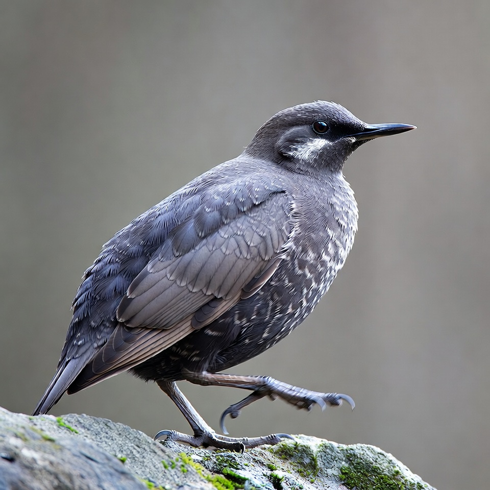 A grey starling with white eye markings and a slender black beak stands on a moss-covered rock. Its feathers are dark grey with subtle speckles, and wings are slightly folded. The bird faces left against a blurred natural background.