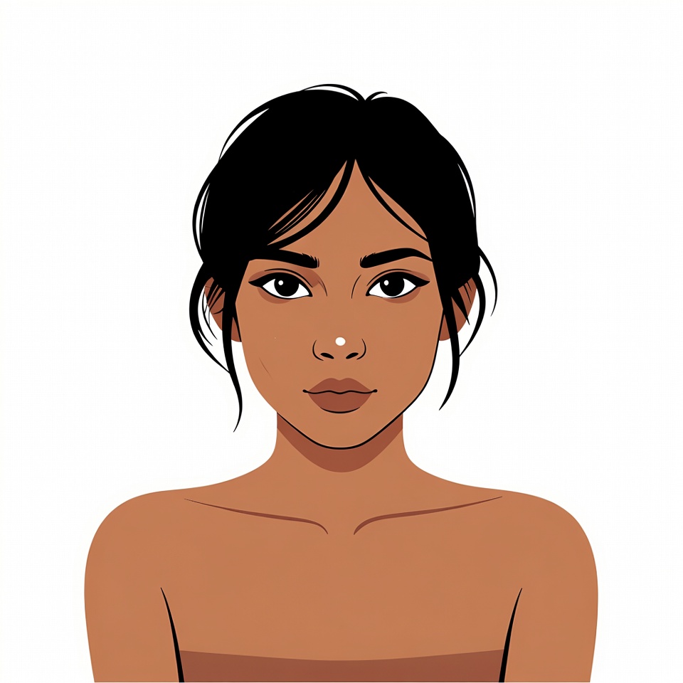 Asian, artistic, bindi, black hair, brown eyes, brown skin, clipart, drawing, face, female, headshot, illustration, isolated background, loose hair, portrait, shoulders, young woman, woman