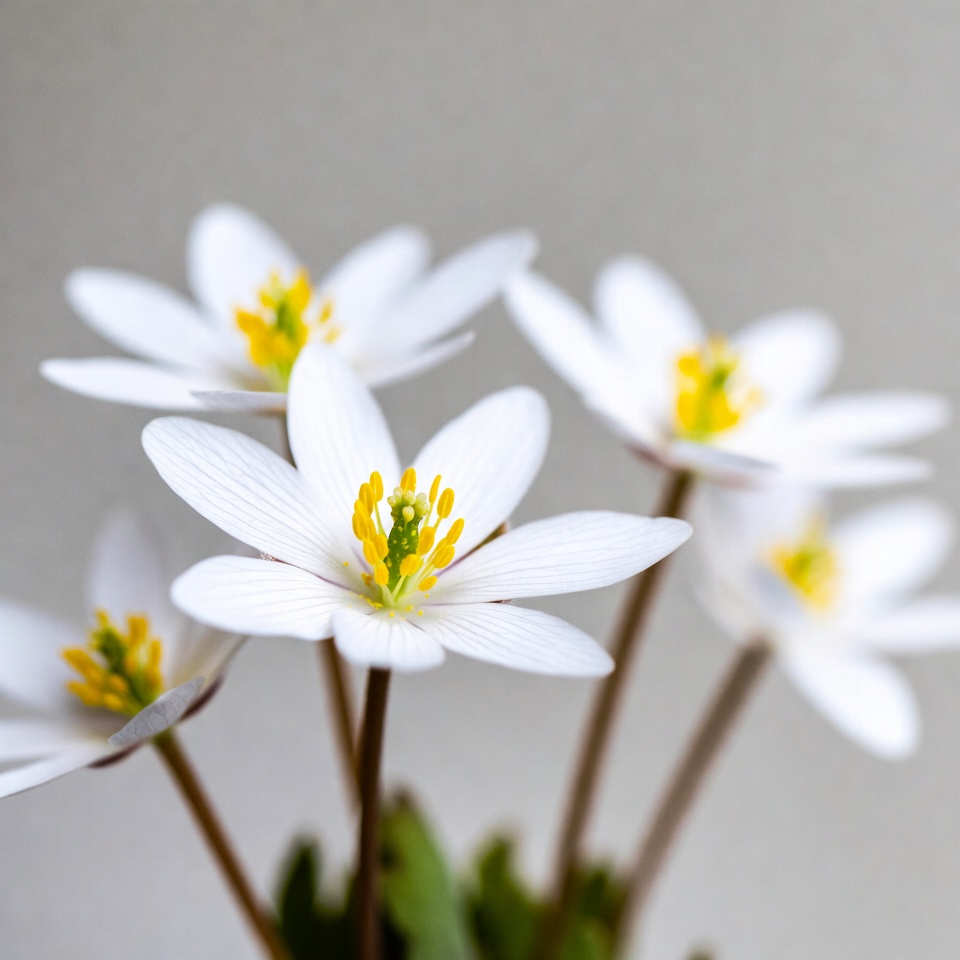 Several delicate white flowers with yellow centers and fine petals are clustered together on thin green stems. The flowers feature prominent star-like shapes against a soft gray blurred background. Fine details of the petals and stamens are sharply focused.