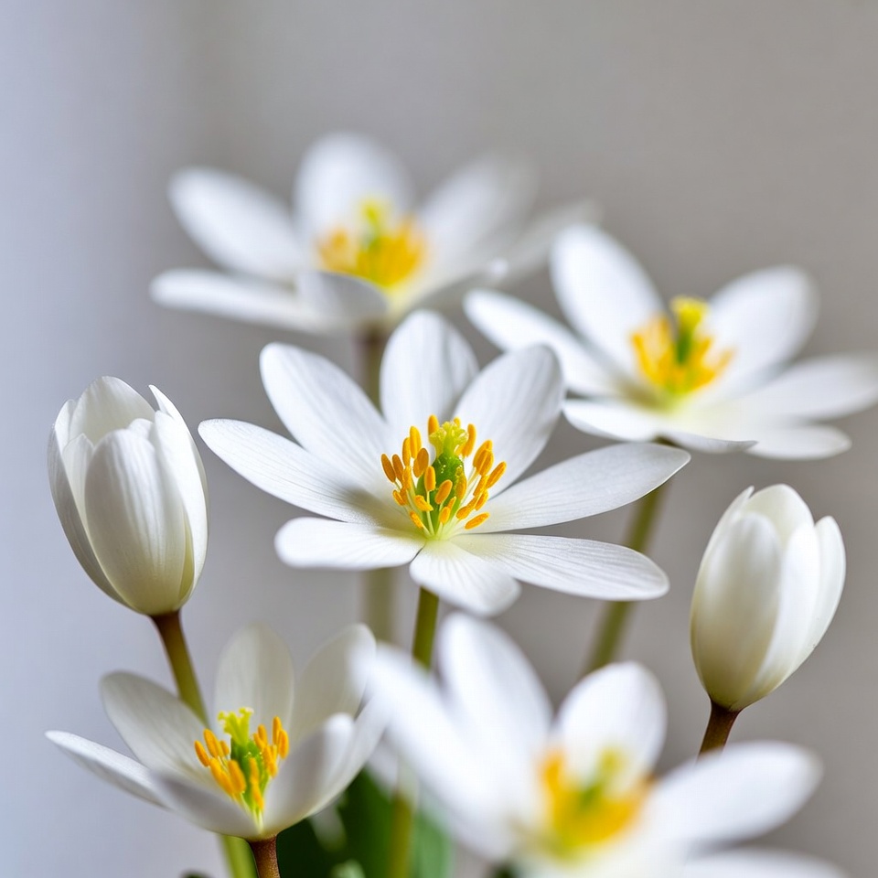 A cluster of delicate white anemone flowers features bright yellow centers and slender green stems. The petals are pure white and slightly cupped, arranged closely together against a light gray background. Fine details of the stamens and buds are visible in sharp focus.