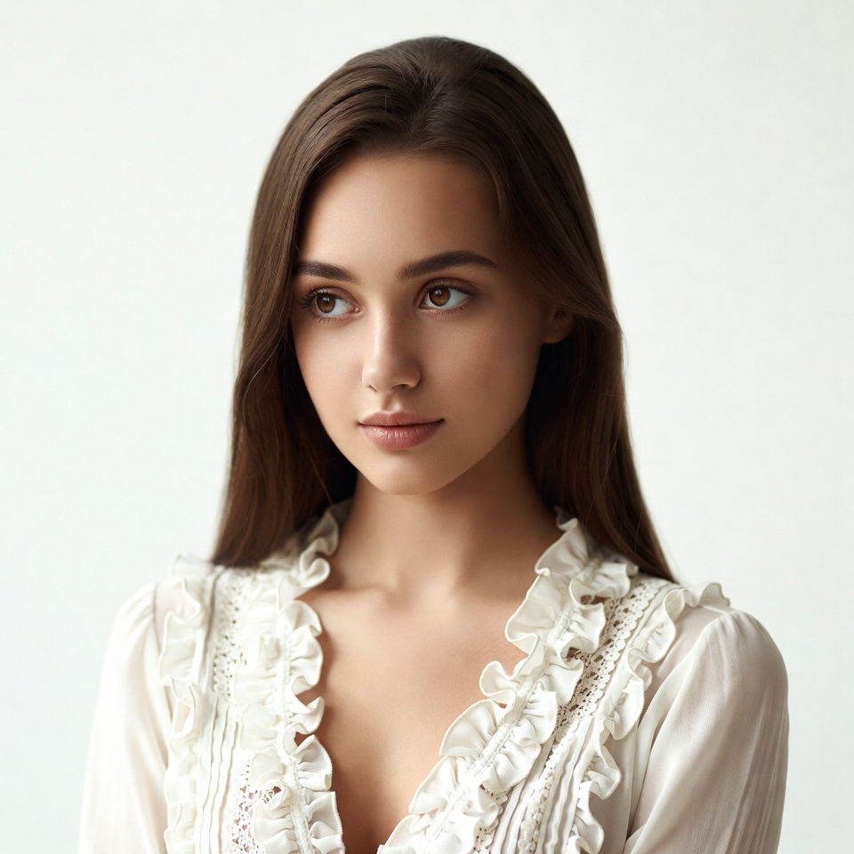 A young woman with long brown hair gazes to the side against a white background. She wears a white lace blouse with ruffled neckline and subtle cleavage. Her expression is soft and natural with light makeup.