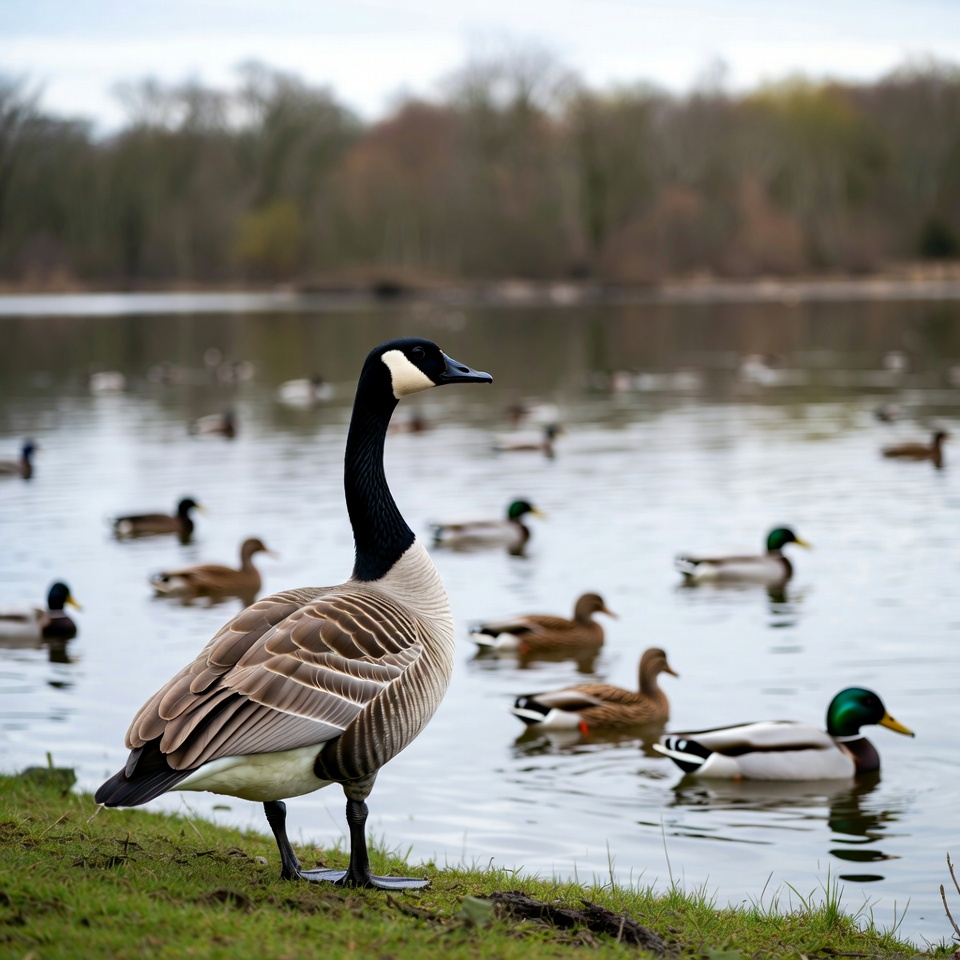 A Canada goose stands on grassy shore near a calm lake surrounded by bare trees. Numerous ducks swim in the water nearby. The scene features overcast skies and natural wetland surroundings.