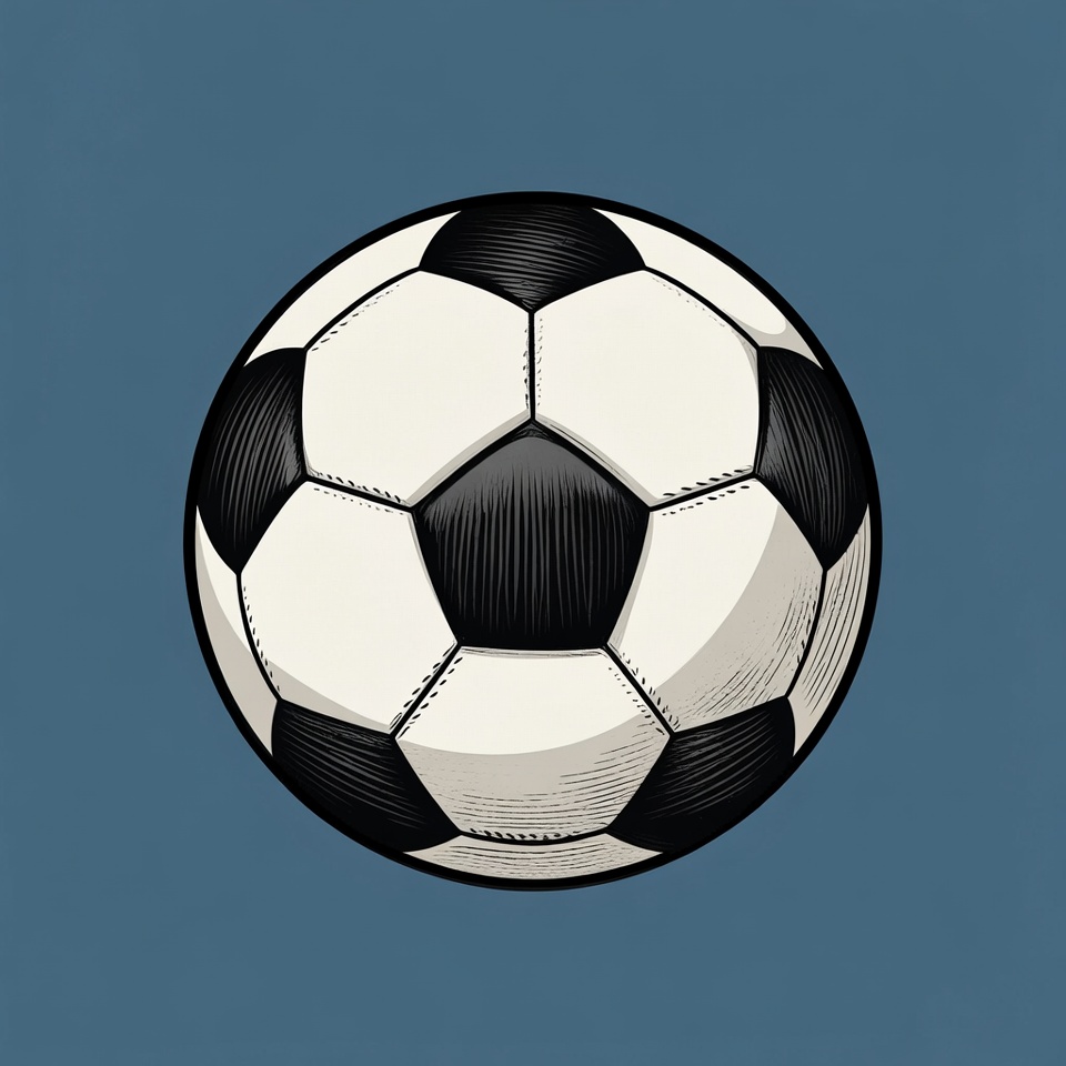 A detailed black and white illustration of a classic soccer ball with pentagonal and hexagonal panels. It features bold black outlines and shading on a solid blue background. The ball is centered and viewed straight on.