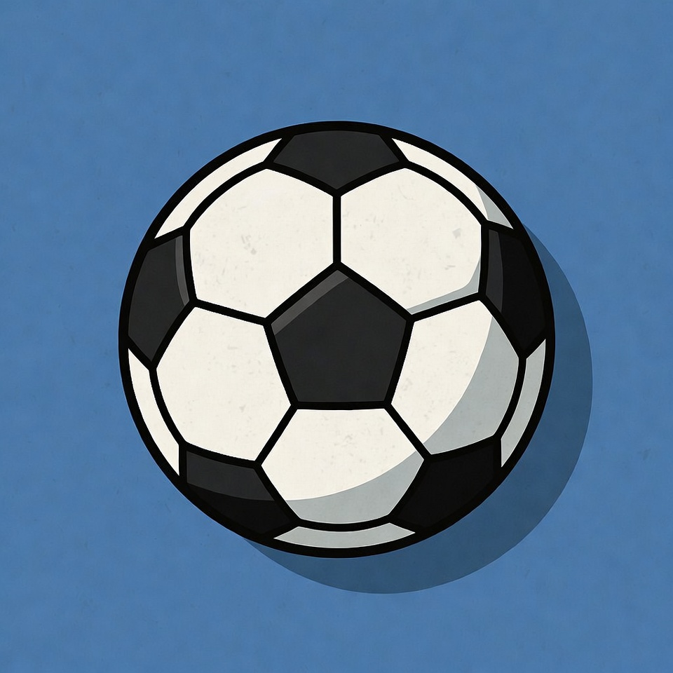 A black and white soccer ball with pentagonal panels is illustrated on a solid blue background. The ball features a subtle shadow for a 3D effect and has a clean, cartoonish outline. It is centered and isolated against the vibrant blue.