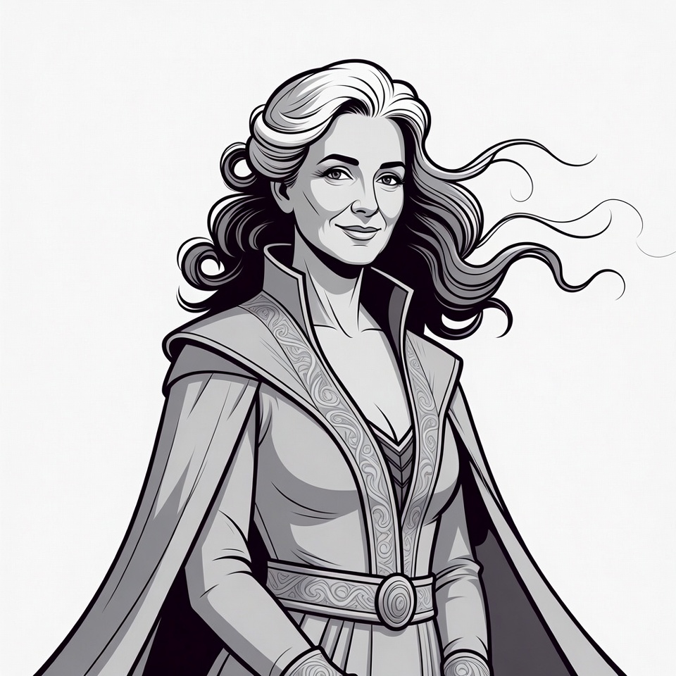 A black and white illustration depicts a mature woman with long wavy white hair smiling confidently. She wears an ornate medieval-style dress with a high collar, intricate embroidery, wide belt, and flowing cape. Her hair billows dramatically, and she stands against an isolated white background.