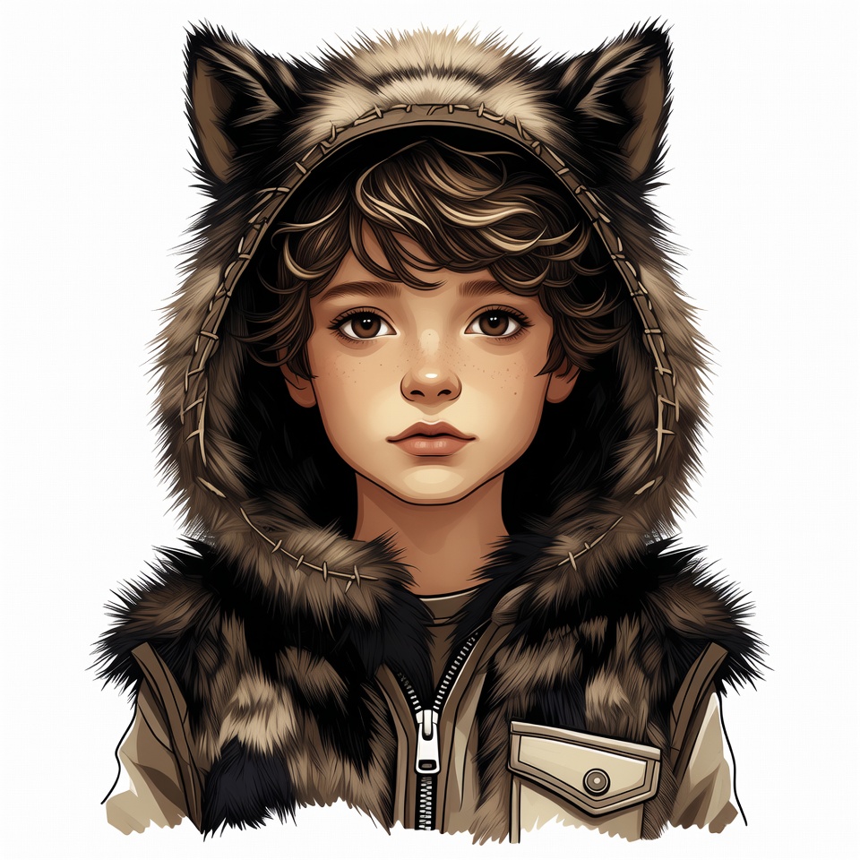 A detailed digital illustration depicts a young boy with curly brown hair and large expressive eyes wearing a hooded jacket trimmed with fluffy wolf-like fur. The hood features prominent furry wolf ears and frames his cute face against an isolated white background. He wears a zipped vest with pockets underneath the hood.