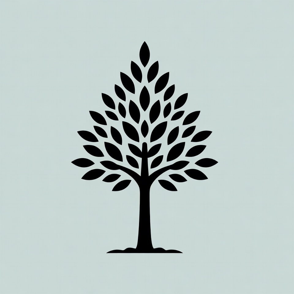 A simple black silhouette of a tree with a triangular canopy of numerous leaves stands on a small mound of soil. The illustration features clean, bold lines against a light blue background. It is a minimalist vector-style graphic isolated on a solid background.