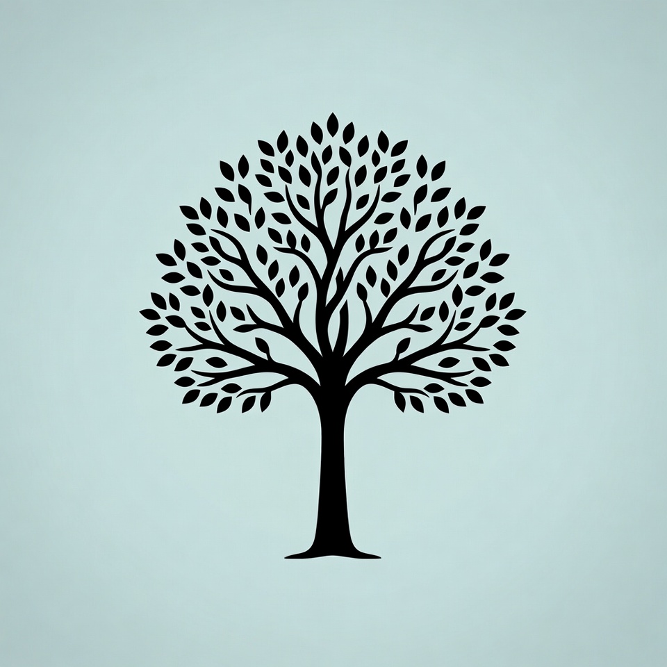A detailed black silhouette of a large tree with dense foliage and sturdy trunk stands centered on a light blue background. The tree features numerous small leaves forming a rounded canopy. It is a simple vector illustration isolated on a solid color background.