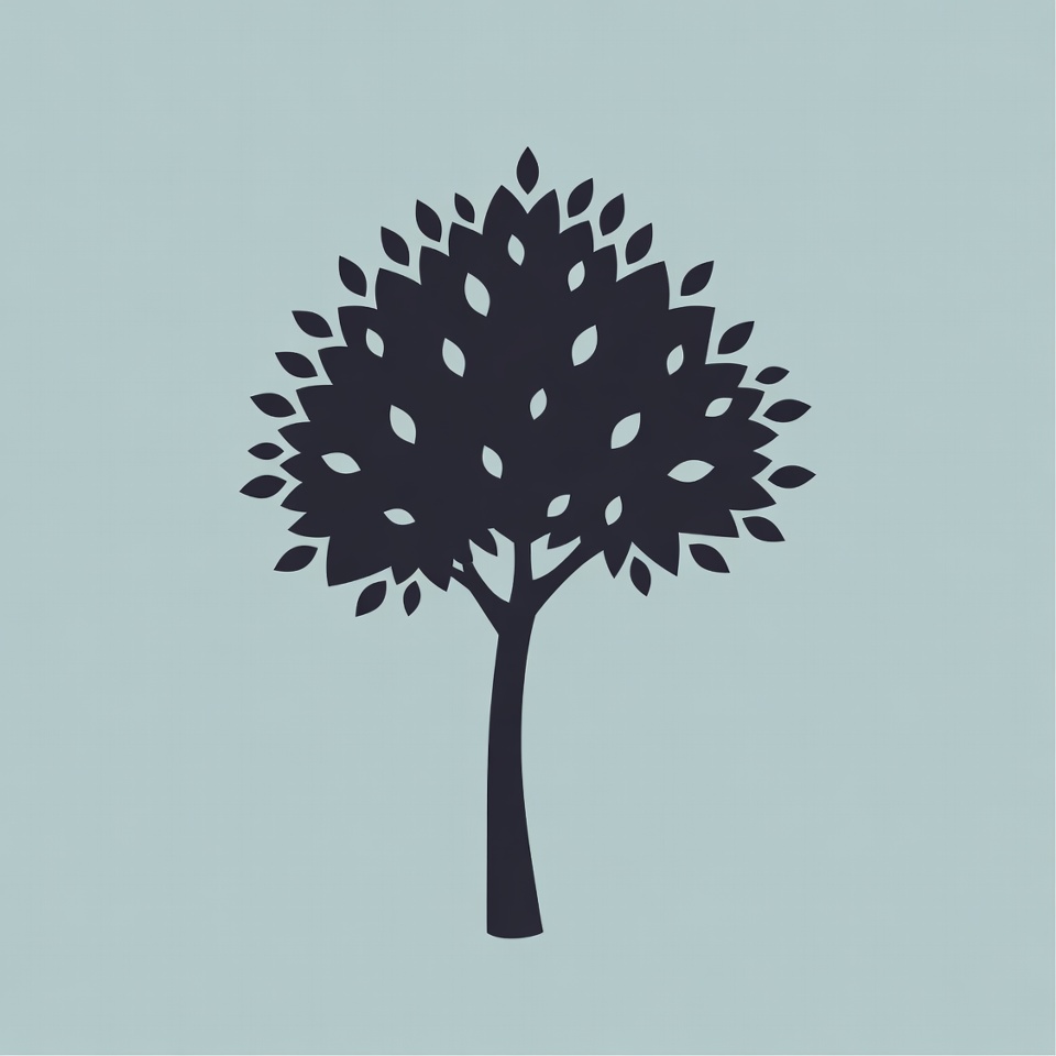 A simple black silhouette of a leafy tree stands against a light blue background. The tree features a straight trunk and a full, rounded canopy of leaves. It is a minimalist vector illustration.