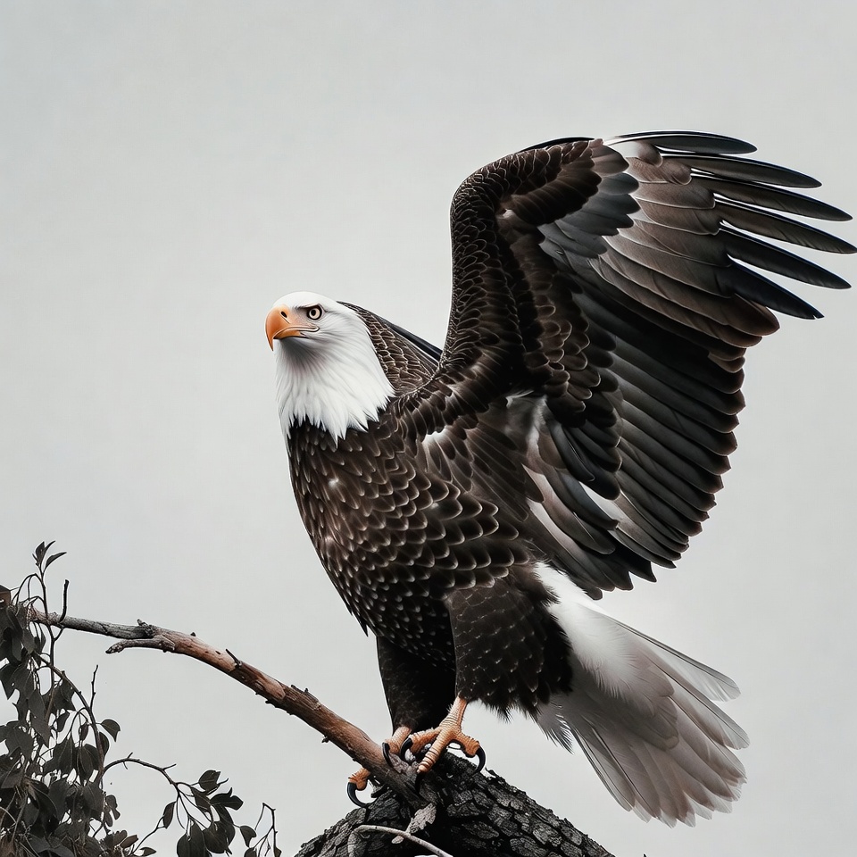 A majestic bald eagle with white head and tail stands perched on a thin branch. Its large wings are spread wide, showcasing dark feathers with white tips. The background is a plain gray sky with sparse branches.