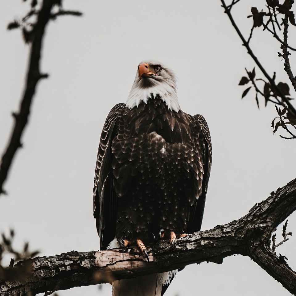 A majestic bald eagle with white head, yellow beak, and dark feathers perches on a tree branch. Sparse branches and leaves frame the bird against a light, foggy background. The eagle gazes upward with intense eyes.