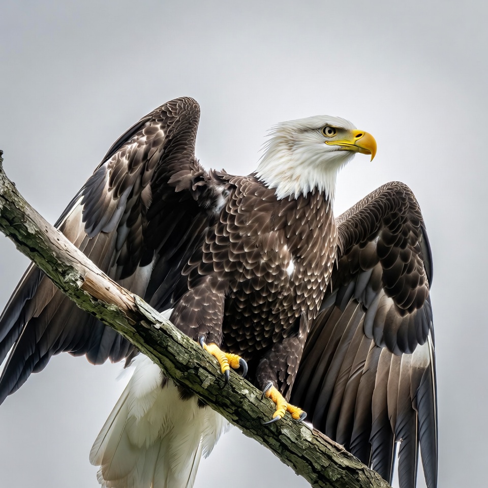 A majestic bald eagle with white head and tail feathers perches on a wooden branch. Its wings are partially spread, showcasing detailed brown feathers and yellow beak and talons. The background is a soft gray sky.
