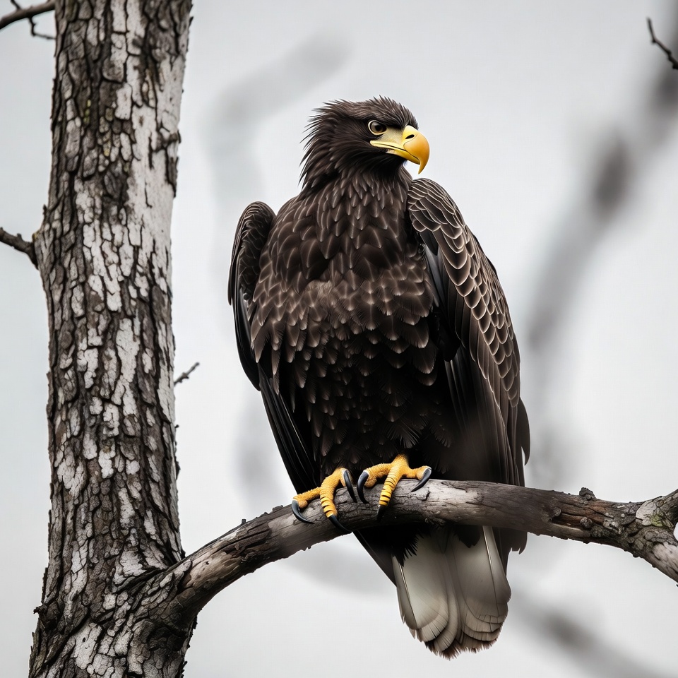 animal, bare tree, bird, bird of prey, dark feathers, eagle, foggy background, nature, perched, raptor, tree branch, white tail, wild bird, wildlife, wings spread, yellow beak, yellow talons, bald eagle