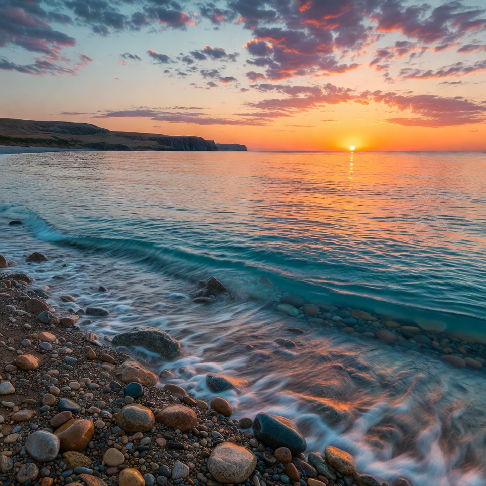 A vibrant sunset illuminates the sky with orange, pink, and purple clouds above a calm sea. Gentle waves lap over a foreground of colorful pebbles on the beach, with distant cliffs visible on the horizon. The sun's reflection shimmers on the turquoise water.