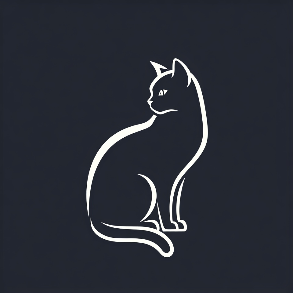 A minimalist white line drawing of a cat in profile sits on a dark background. The cat faces right with pointed ears, sharp eyes, and a curled tail. The isolated illustration features smooth outlines and negative space.