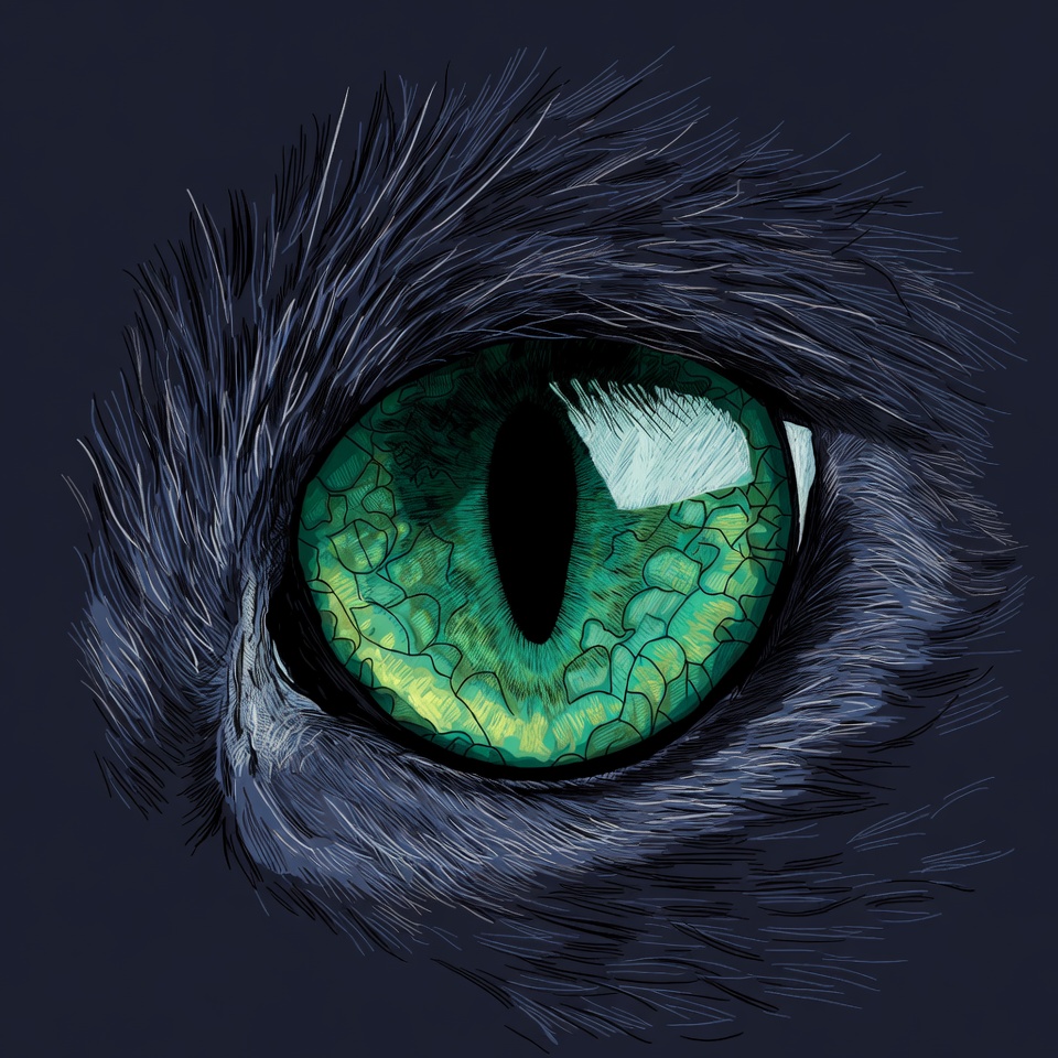 A detailed close-up illustration of a cat's striking green eye with black pupil and reflective highlights. Surrounding dark fur frames the vibrant emerald iris on a navy background. The artwork features textured fur and glossy eye details.