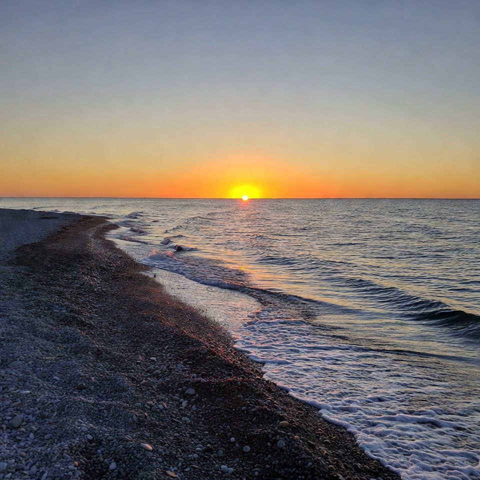 A vibrant sunset illuminates the horizon with orange and purple hues over a calm sea. Gentle waves lap against a pebbly shoreline with scattered vegetation. The sun dips low, casting reflections on the water.