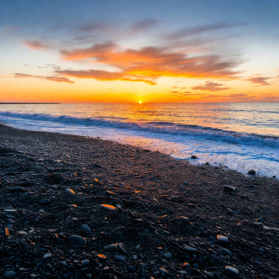 A vibrant sunset with orange and pink skies illuminates a pebbly beach. Gentle waves lap against the dark stones near the horizon. Clouds streak across the colorful sky above the calm ocean.