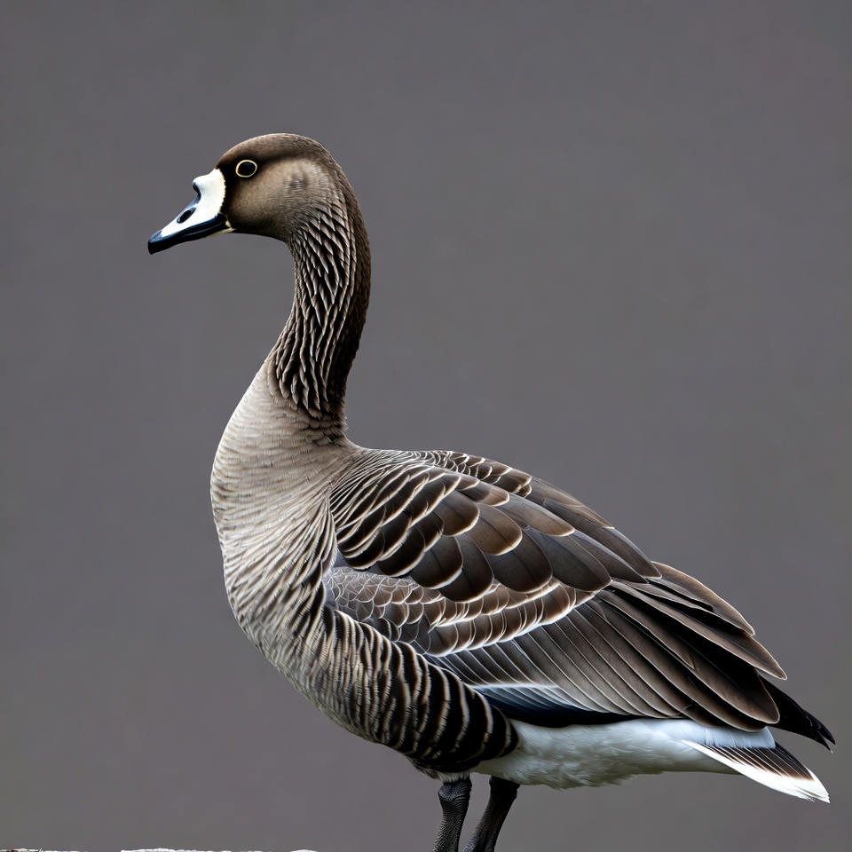 A white-faced whistling duck stands on a gray background. It has a brown head with a distinctive white facial patch and black bill. Its body features intricate brown and white feather patterns with dark wings.