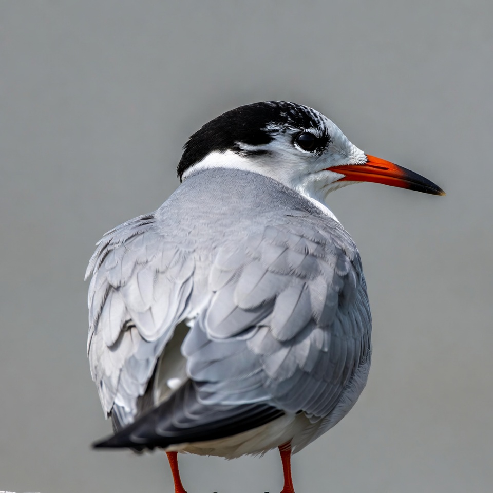 avian, beak, bird, black cap, feathers, gray feathers, isolated background, nature bird, orange bill, orange legs, shorebird, side view, standing bird, tern, white feathers, wildlife, gull-billed tern
