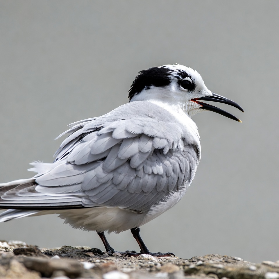 avian, bird, black beak, black cap, calling bird, fluffy feathers, gray background, isolated background, open beak, rock, rocky surface, sea bird, seabird, tern, white feathers, wildlife, white tern