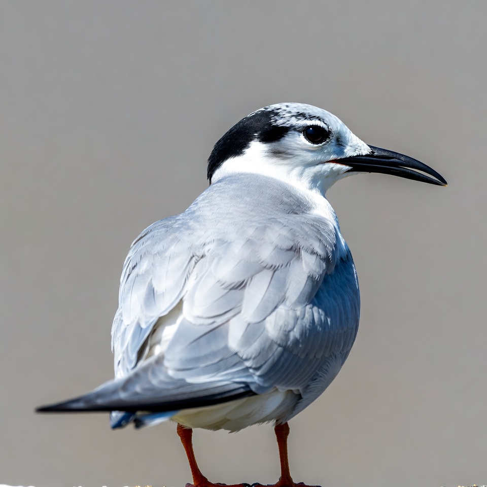 avian, bird, black beak, black cap, feathers, gray background, isolated, red legs, sea bird, standing bird, tern, white bird, wildlife, gull-billed tern