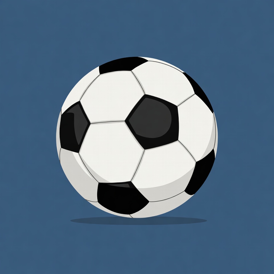 A classic black and white soccer ball is illustrated with pentagonal panels against a solid blue background. The ball features alternating black pentagons and white sections, rendered in a simple cartoon style. It is centered and isolated with a subtle shadow beneath.