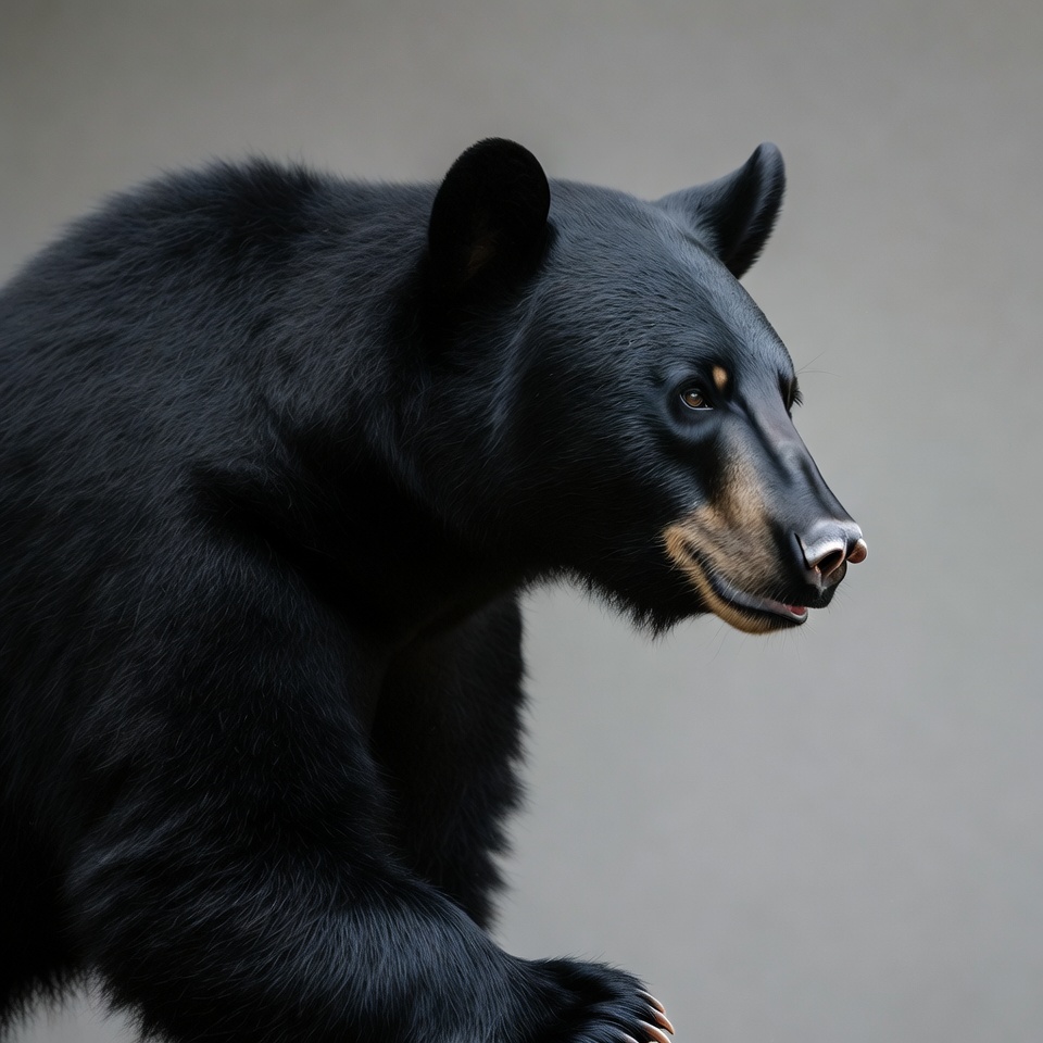 A black bear with glossy fur stands in profile against a plain gray background. Its head is turned slightly, showing dark eyes, a brown muzzle, and a subtle smile. The bear's front paw is visible with sharp claws.