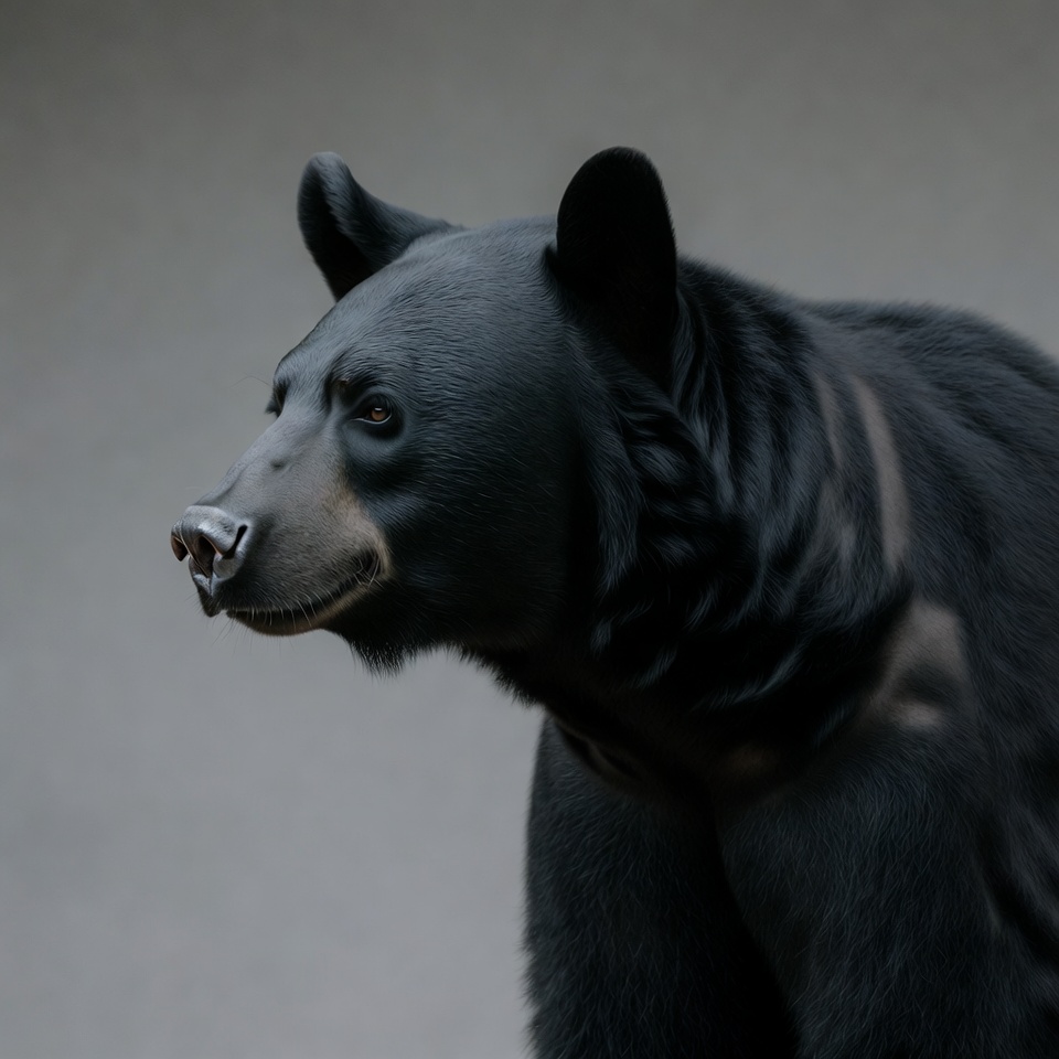 A black bear with glossy dark fur faces to the side against a plain gray background. Its head is turned in profile, showcasing prominent rounded ears, a shiny black nose, and intense dark eyes. The bear's thick fur is detailed around the neck and shoulders.