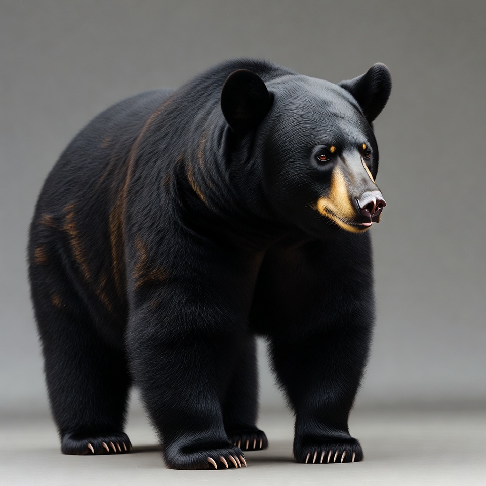 A realistic black bear stands on all fours against a plain gray background. The bear has glossy black fur with subtle brown highlights on its face and shoulders. It faces slightly to the side with a focused expression, showcasing its large paws and muscular build.