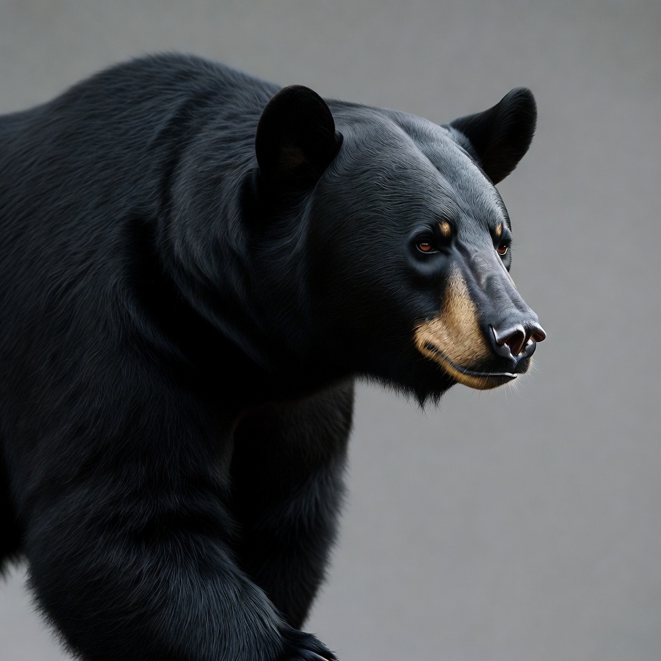 A majestic black bear with glossy black fur and reddish-brown muzzle faces sideways against a plain gray background. Its expressive eyes and detailed snout are prominently featured in this close-up portrait. The bear's powerful build and furry paws are visible as it stands in profile.