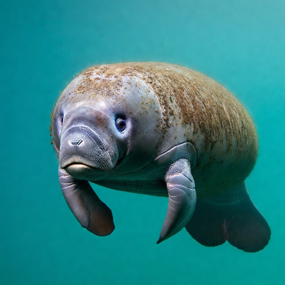 algae covered, aquatic, flippers, gray skin, isolated background, large eyes, marine mammal, ocean animal, sea cow, sea creature, swimming, turquoise water, underwater, wildlife, manatee
